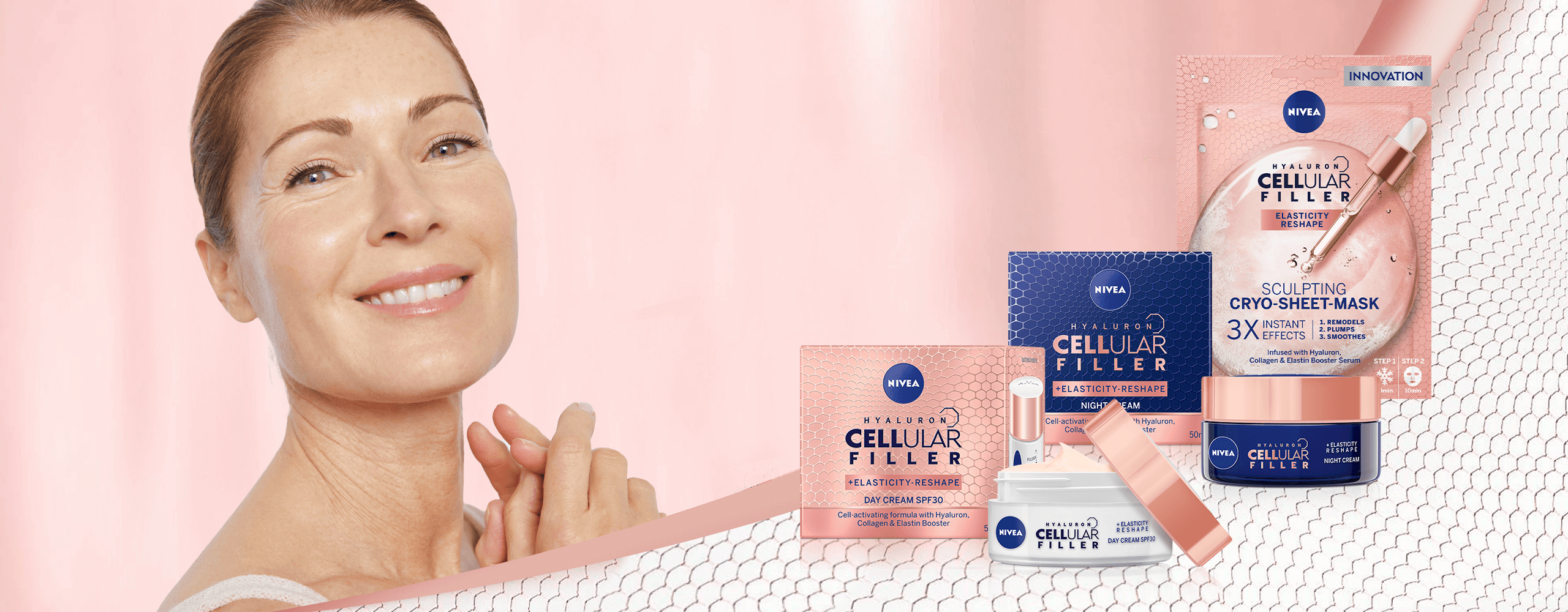 Gama NIVEA Hyaluron Cellular Filler + Elasticitate este special creată pentru a răspunde nevoilor tenului, care a început să-și piardă tonusul și elasticitatea. Astfel, produsele oferă hidratare intensă și accelerează regenerarea. După folosire, tenul devine vizibil mai revitalizat și elastic, iar ridurile profunde sunt reduse.