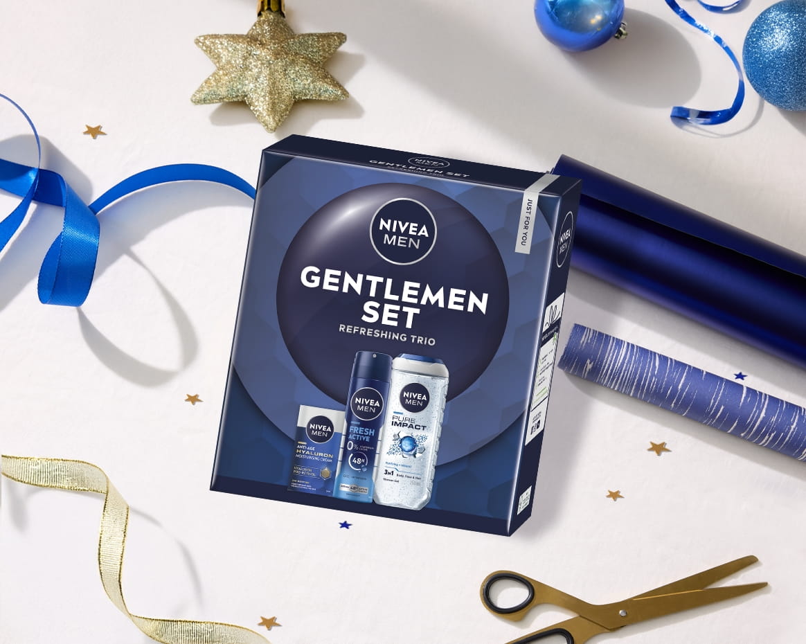 Dăruiește un cadou special: setul NIVEAMEN Gentlemen Set format din Crema antirid cu Hialuron NIVEAMEN cu SPF 15, Gelul de duș NIVEAMENPure Impact și Deodorantul Spray NIVEAMENFreshActive.
