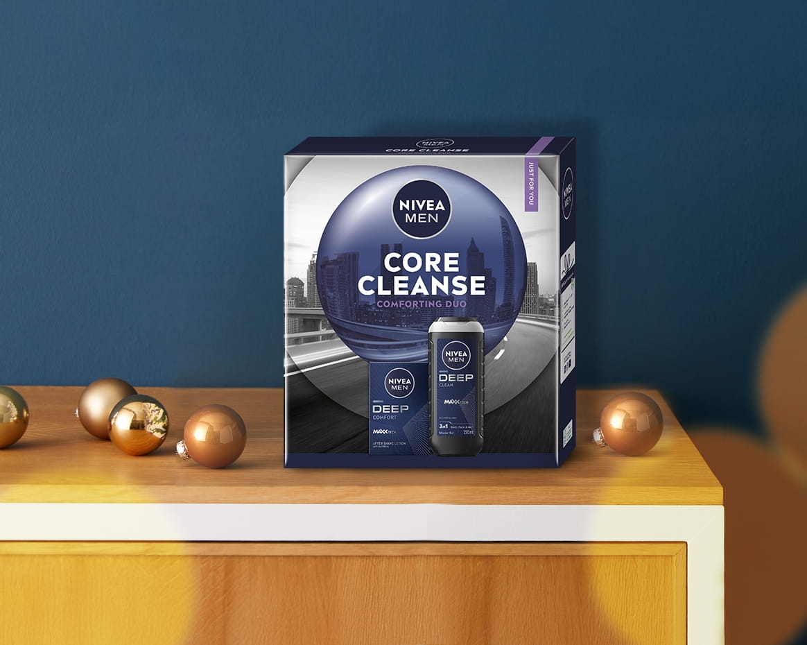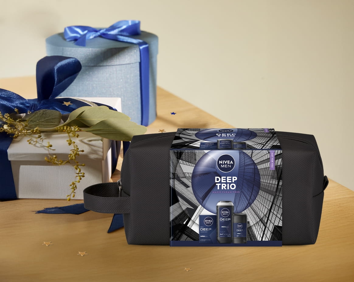 Dăruiește un cadou special: setul NIVEAMENDeep Trio format din Loțiune după ras NIVEAMENDeep, Gelul de duș NIVEAMENDeep și Deodorantul stick NIVEAMENDeep.