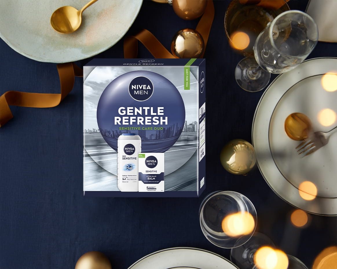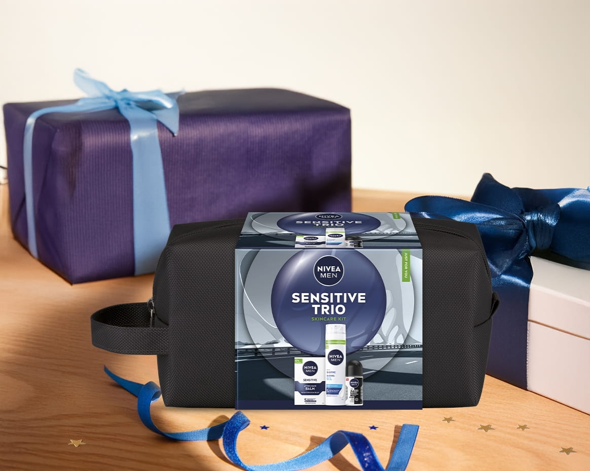 Dăruiește un cadou special: setul NIVEAMENSensitive Trio format din Balsamul după ras NIVEAMENSensitive, Gelul pentru ras NIVEAMENSensitive și Deodorantul roll-on NIVEAMENBlack & White Invisible Power.