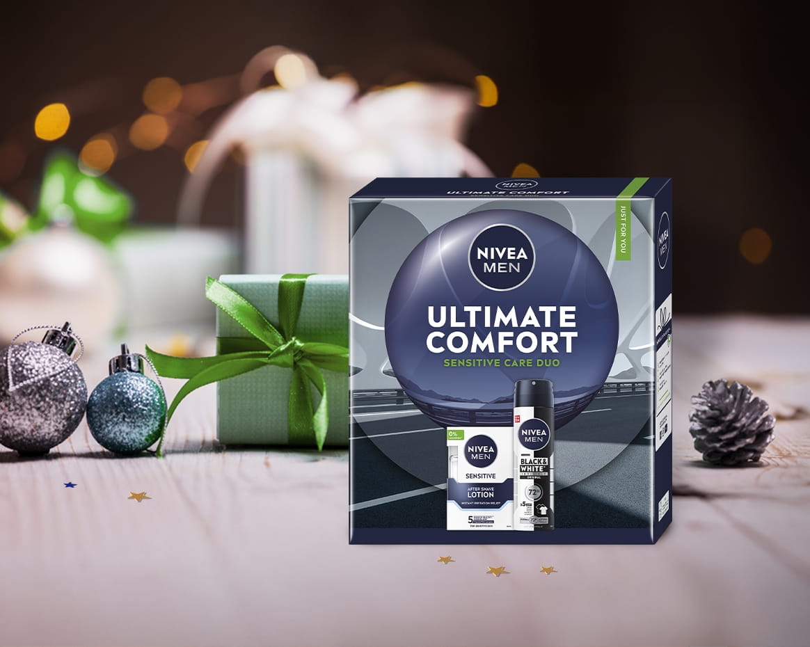 Dăruiește un cadou special: setul NIVEAMEN Ultimate Comfort format din Loțiunea după ras NIVEAMENSensitive și Deodorantul spray NIVEAMENBlack & White Invisible Original.
