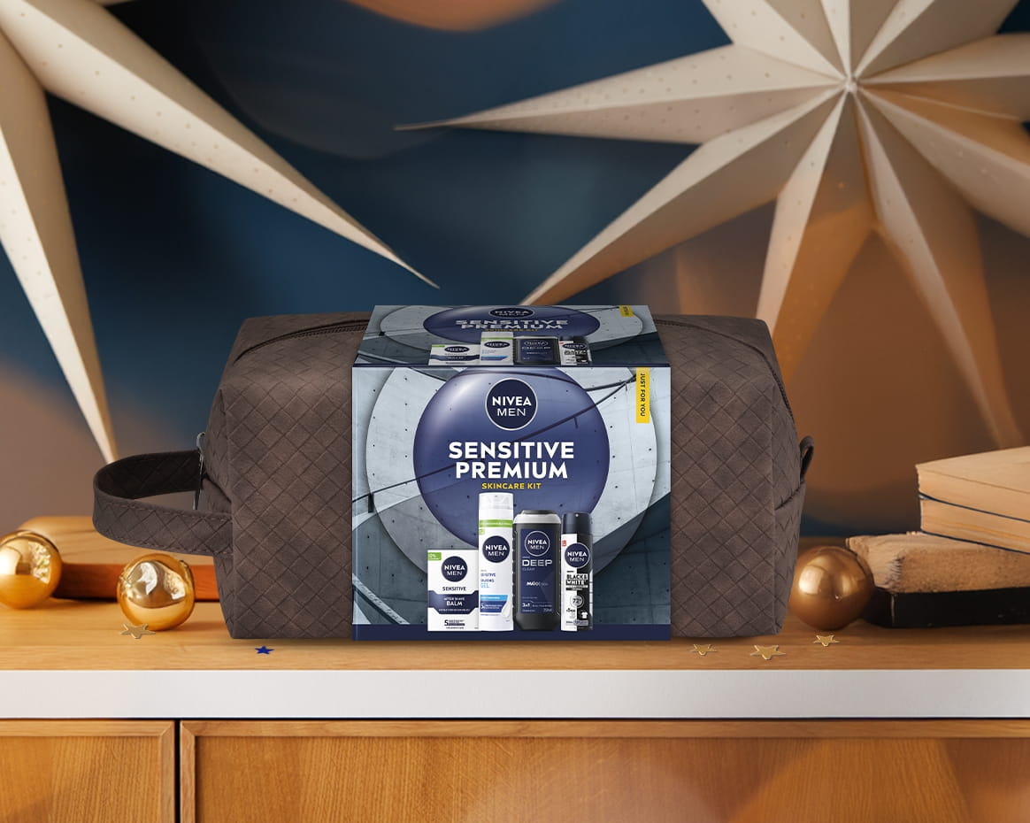 Dăruiește un cadou special: setul NIVEAMENSensitive Premium format din Balsamul după ras NIVEAMENSensitive, Gelul pentru ras NIVEAMENSensitive, Deodorantul spray NIVEAMENBlack & White Invisible Power și Gelul de duș NIVEAMENDeep.