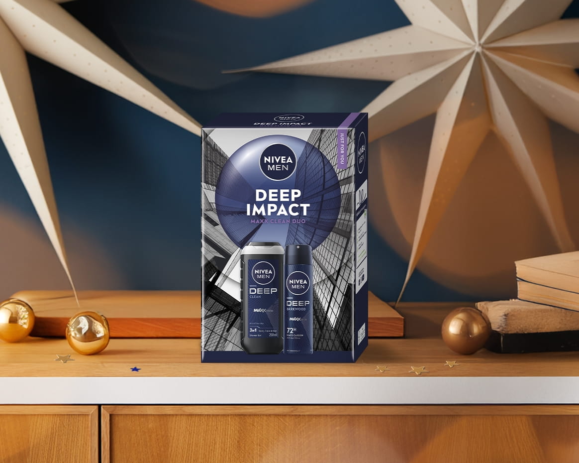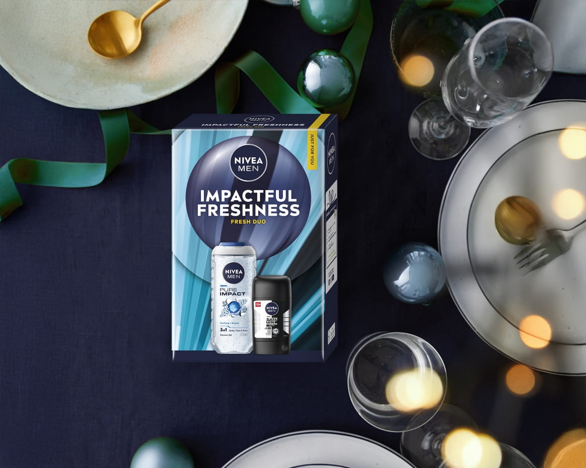 Dăruiește un cadou special: setul NIVEAMEN IMPACTFULL FRESHNESS format din Gelul de dușNIVEAMENPURE IMPACT și Deodorantul stick NIVEABLACK & WHITE Invisible Original.
