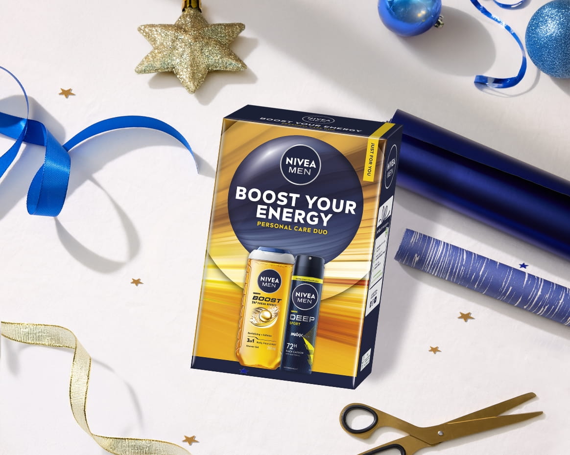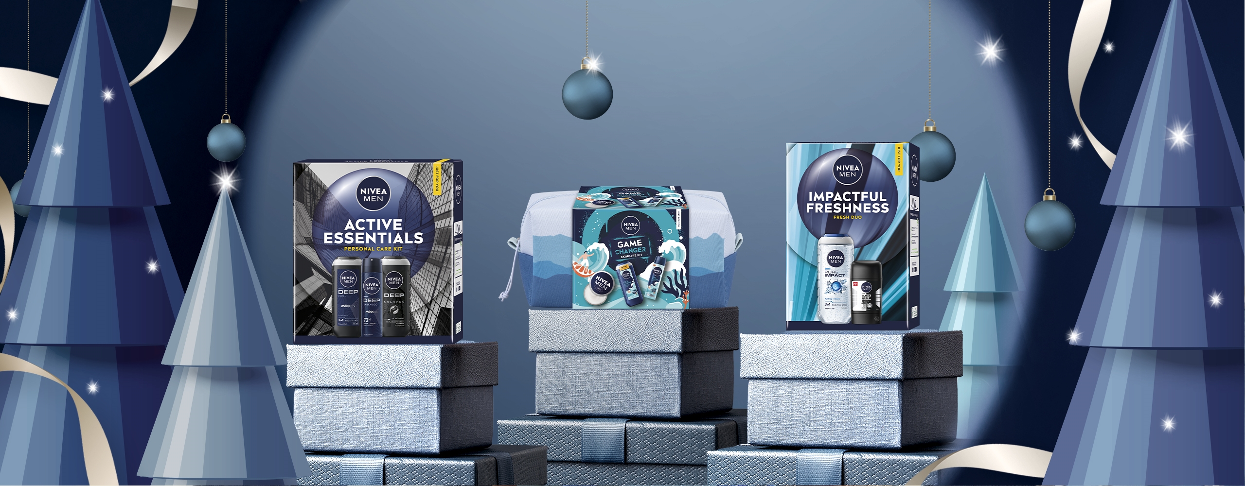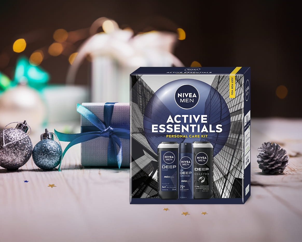 Dăruiește un cadou special: setul NIVEAMENACTIVE ESSENTIALS format din Gelul de duș NIVEAMENDEEP, Șamponul NIVEAMENDEEP și Deodorantul spray NIVEAMENDEEP.