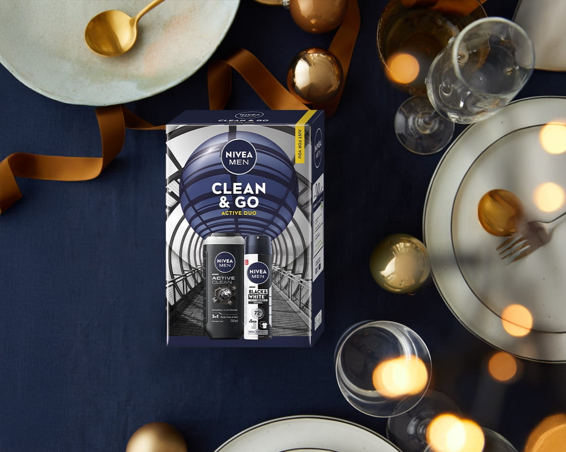 Dăruiește un cadou special: setul NIVEAMEN CLEAN & GO format din Deodorantul spray NIVEAMENBLACK & WHITE INVISIBLE POWER și Gelul de duș NIVEAMENACTIVE CLEAN.