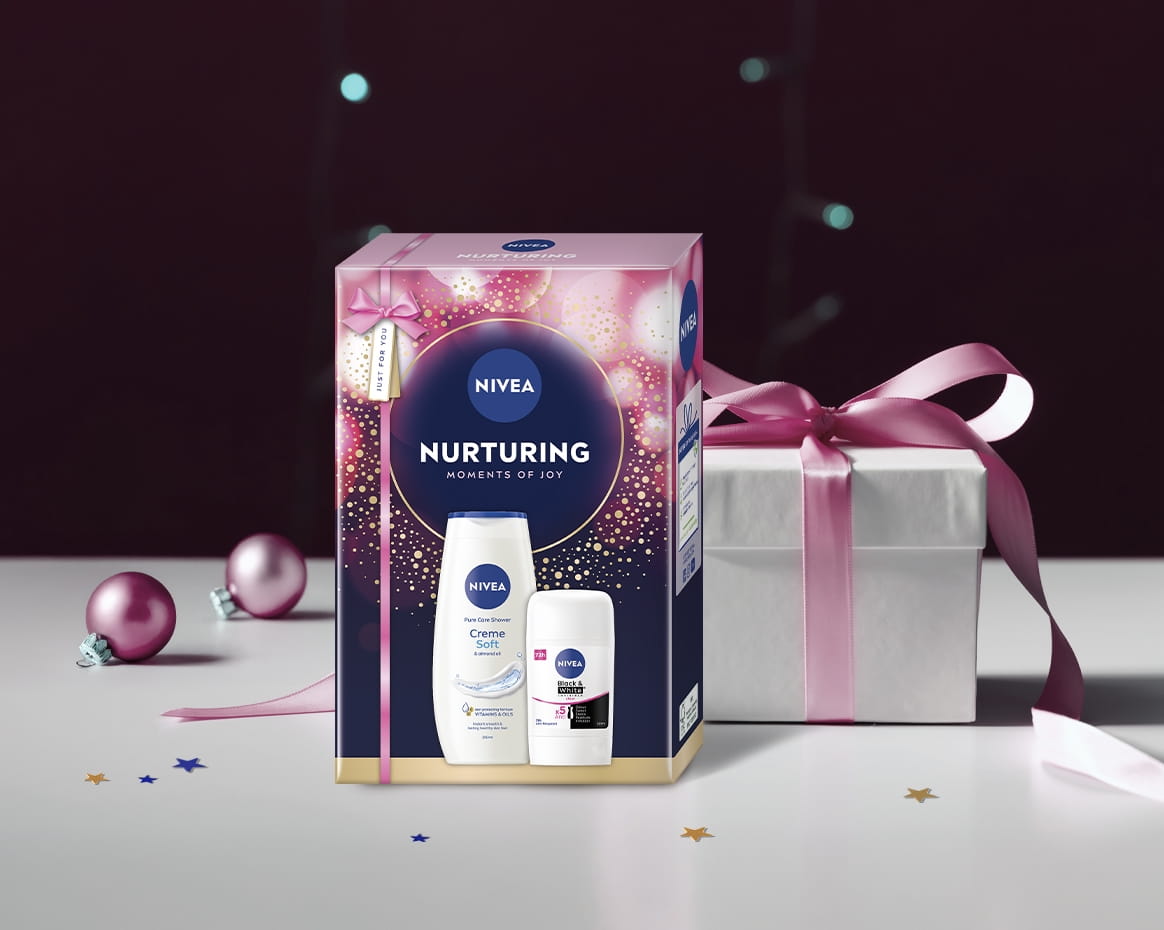 Dăruiește un cadou special: setul NIVEA Nurturing format din Gelul de duș NIVEACreme Soft și Deodorantul stick NIVEABlack & White Invisible Clear.