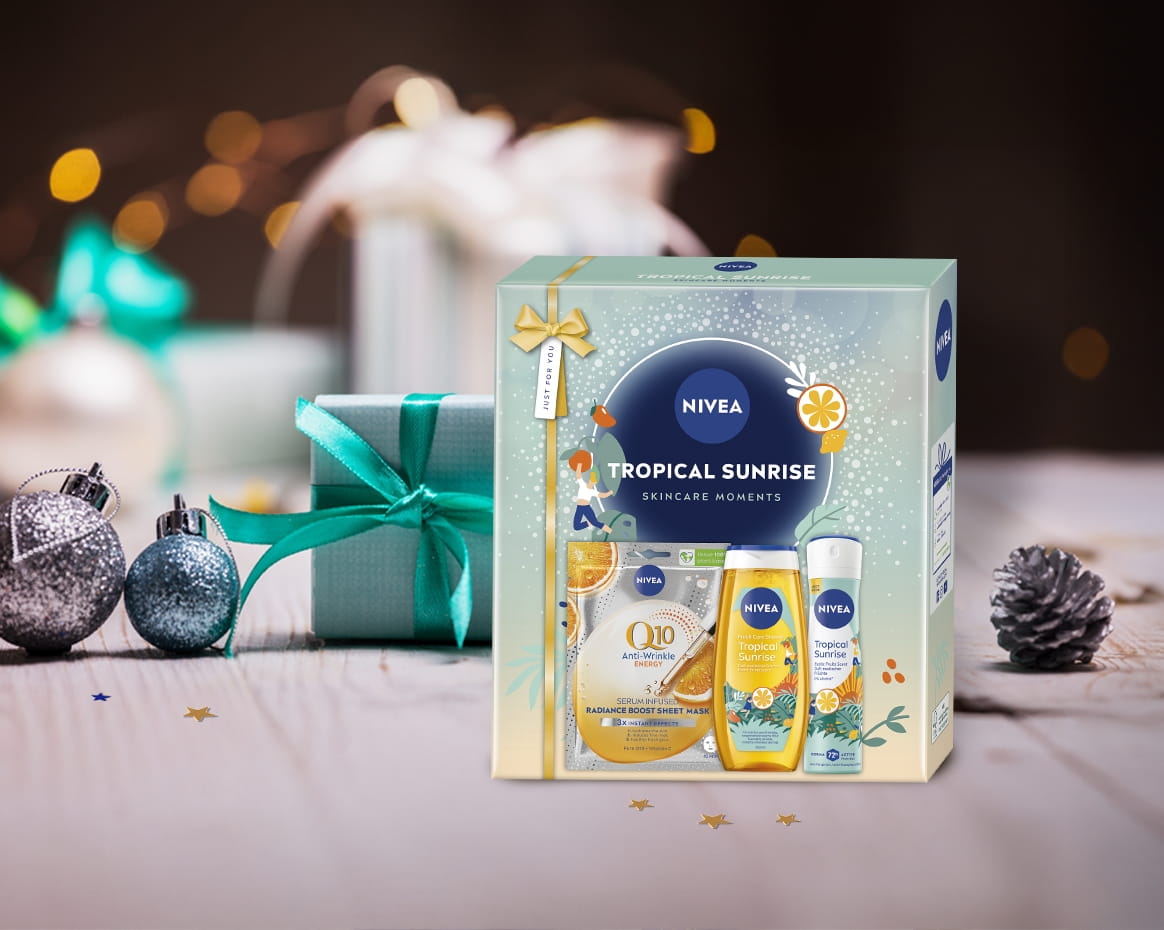 Dăruiește un cadou special: setul NIVEA Tropical Sunrise format din Masca șervețel infuzată cu serum NIVEA Q10 Energy, Gelul de duș în ediție limitată NIVEA Tropical Sunrise și Antiperspirantul spray în ediție limitată NIVEA Tropical Sunrise.