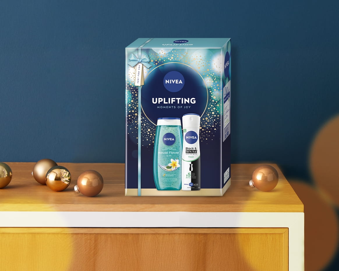 Dăruiește un cadou special: setul NIVEA Uplifting format din Gel de dus NIVEA Frangipani & Oil și Antiperspirant spray NIVEABlack & White Invisible Fresh.