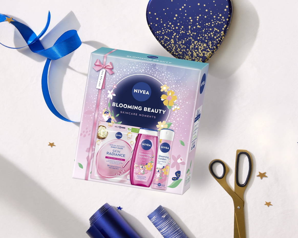Dăruiește un cadou special: setul NIVEA Blooming Beauty format din Masca șervețel infuzată cu serum NIVEASkin Radiance, Gelul de duș în ediție limitată NIVEA Blooming Garden și Antiperspirantul spray în ediție limitată NIVEA Blooming Garden.