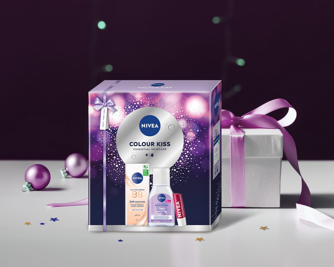 Dăruiește un cadou special: setul NIVEAColorKiss format din Crema BB NIVEA 5 în 1 nuanță deschisă și Apă micelara NIVEA Soothing All-în-1 pentru ten sensibil și Balsam de buze NIVEA CHERRY.
