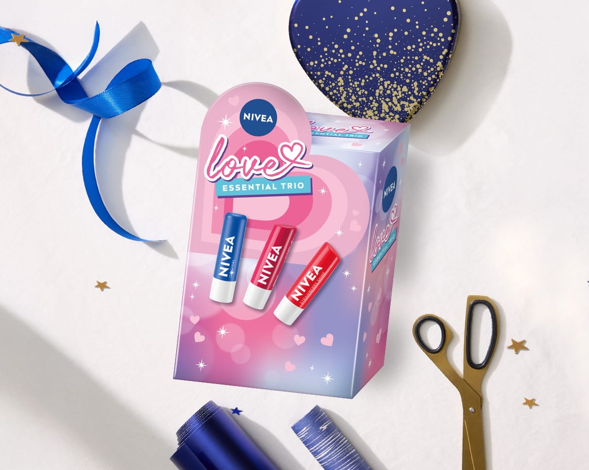 Dăruiește un cadou special: setul NIVEA Essential Trio format din Balsamul hrănitor de buze NIVEAOriginal, Balsamul de buze NIVEA Cherry Shine, Balsamul de buze NIVEA Strawberry Shine.