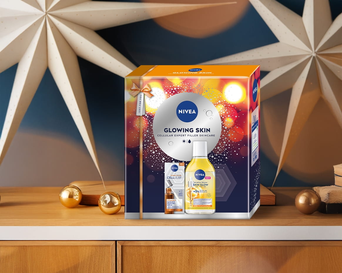 Dăruiește un cadou special: setul NIVEA Glowing Skin format din Serumul cu Vitamina C NIVEACELLULAR Expert Filler și Apa Micelară infuzată cu serum NIVEASKIN GLOW.