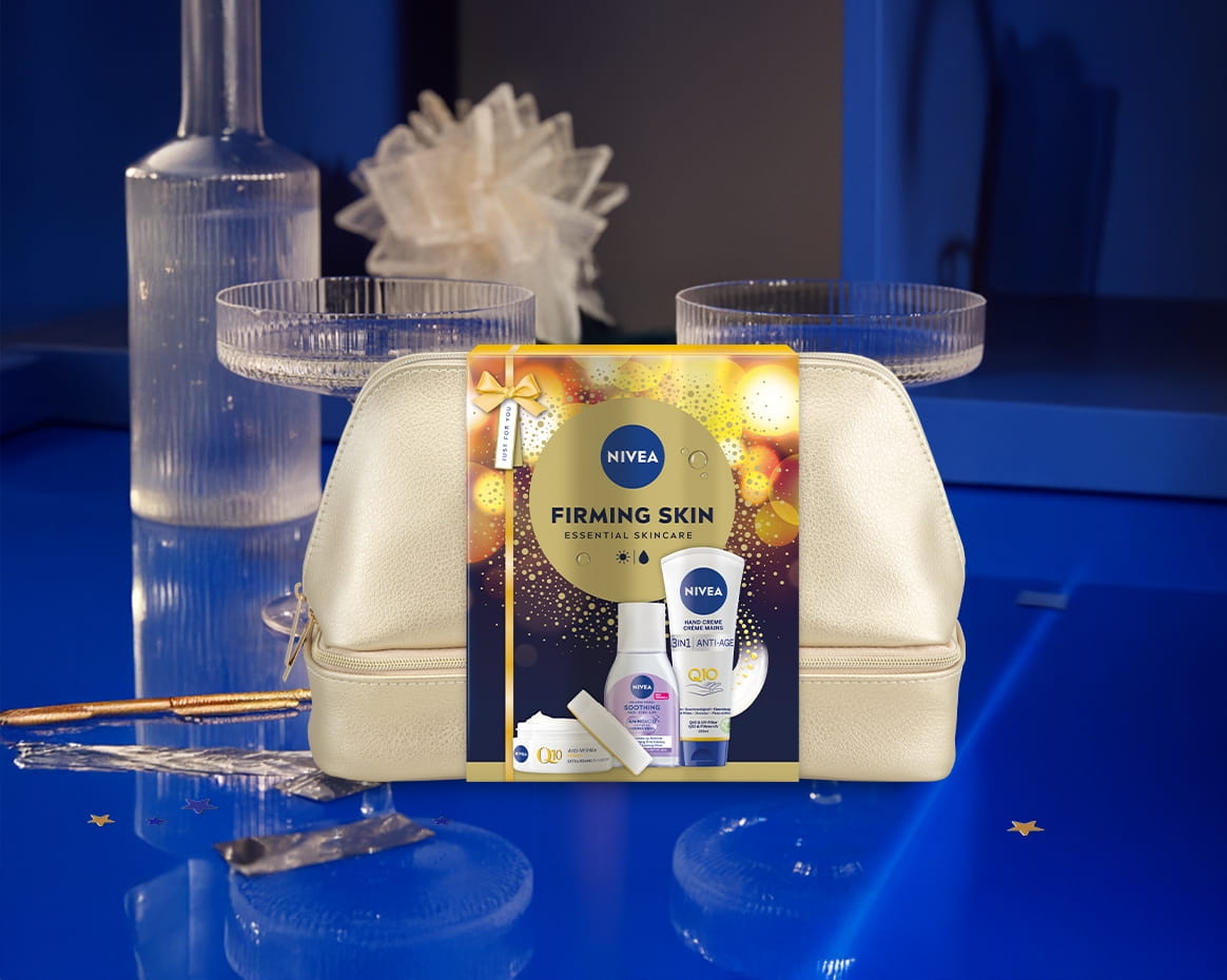 Dăruiește un cadou special: setul NIVEA Q10 Firming Skin format din Crema de zi anti-rid NIVEA Q10 SPF 15, Apă micelară NIVEA Soothing All-în-1 pentru ten sensibil și Crema de mâini anti-îmbătrânire NIVEA 3în1.