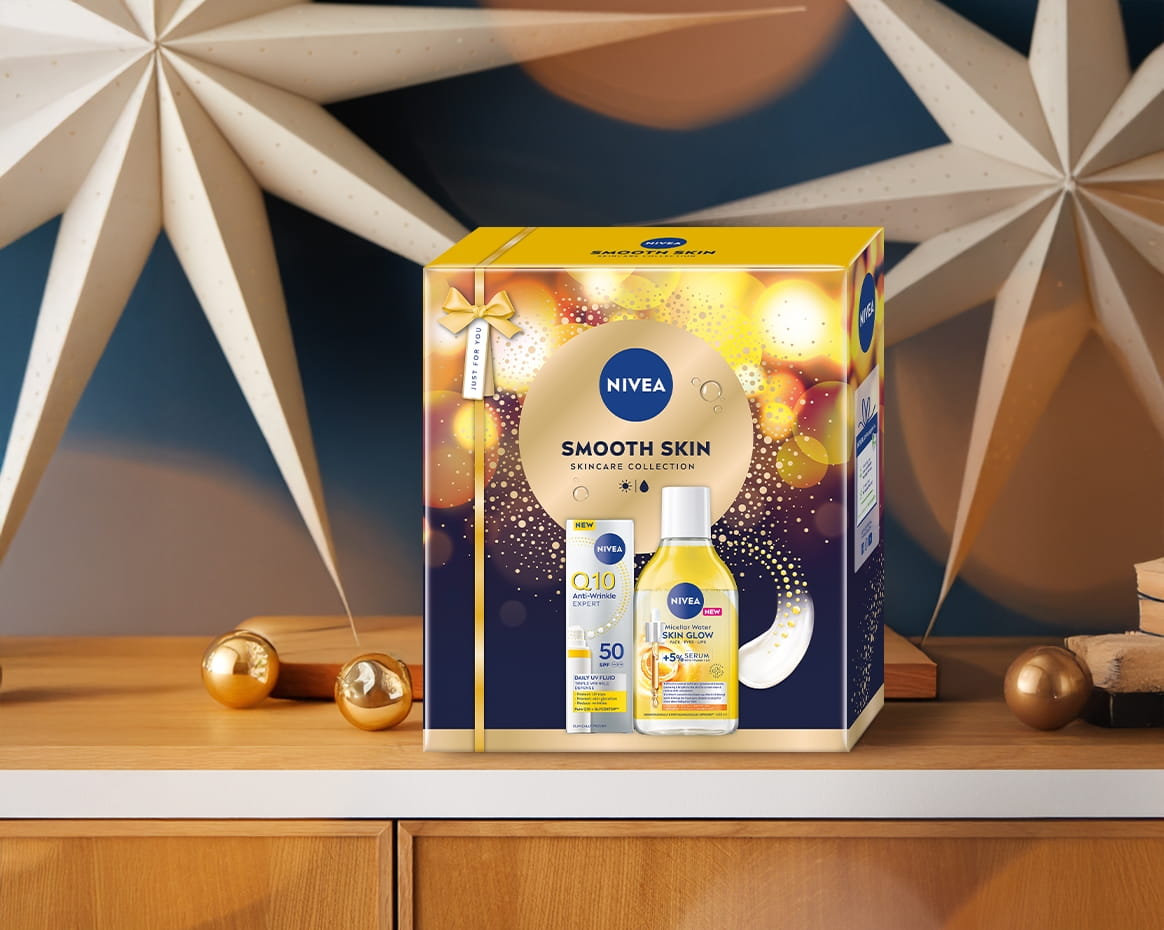 Dăruiește un cadou special: setul NIVEA Smooth Skin format din Fluidul de zi NIVEA Q10 cu SPF 50 și Apa Micelară infuzată cu serum cu efect de iluminare NIVEASKIN GLOW.