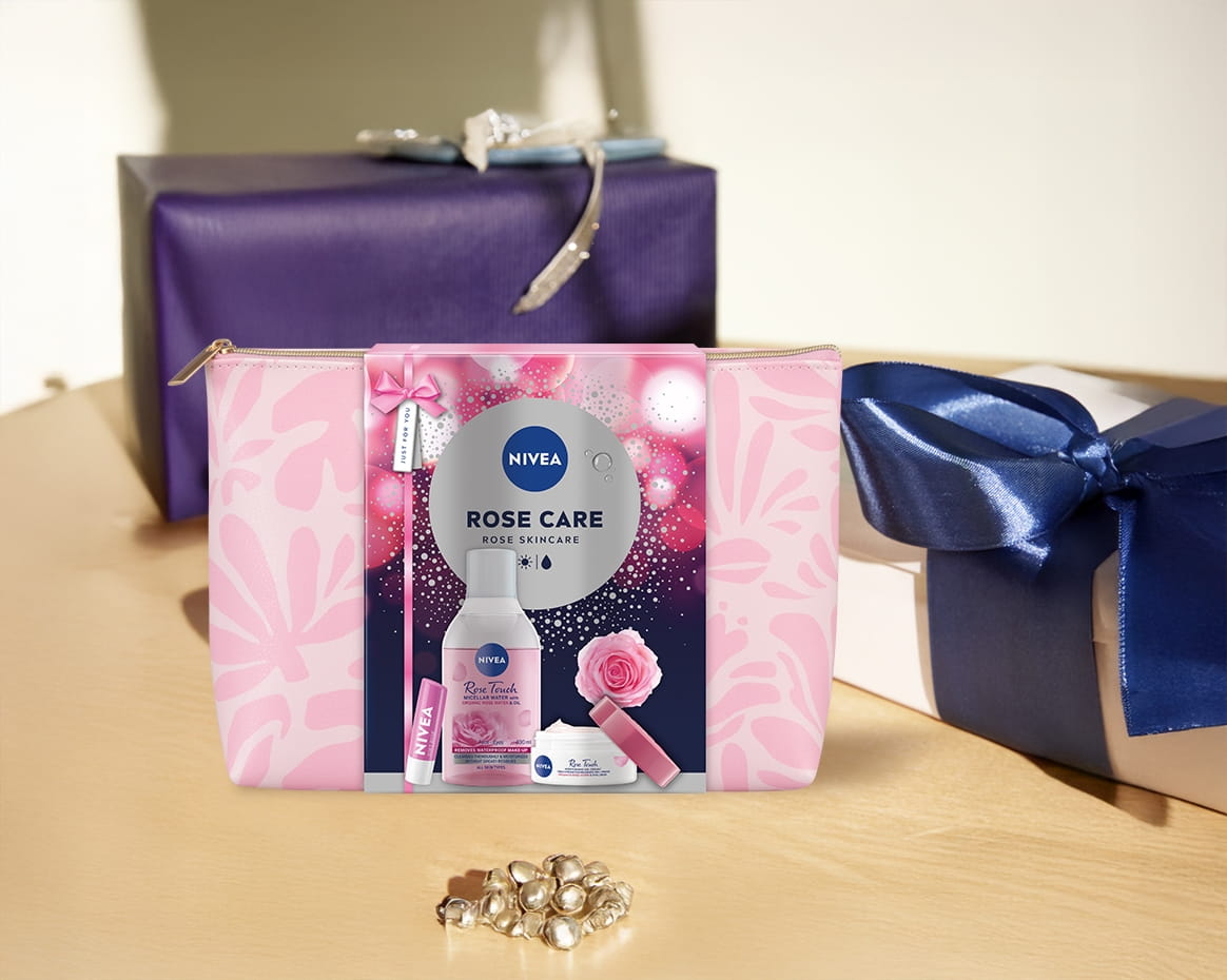 Dăruiește un cadou special: setul NIVEARoseCare format din Gelul-cremă cu apă de trandafir NIVEAROSE TOUCH, Apă micelară cu apă de trandafiri NIVEAROSE TOUCH și Balsam de buze NIVEAROSE.