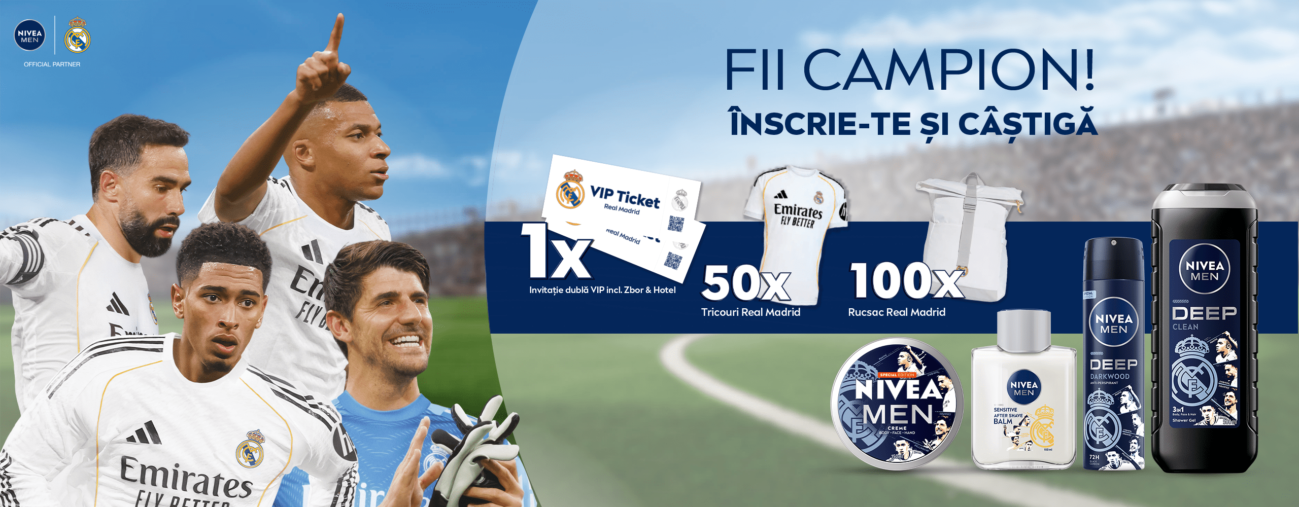 Cu NIVEA MEN, ai grijă de pielea ta și intră în joc ca un adevărat campion! Bucură-te de mai multă îngrijire, dar și de premii pe măsură. Cumpără oricare 2 produse NIVEA MEN, în perioada 1.03-31.03.2026, înscrie bonul fiscal prin SMS la 1869 sau pe site și poți căștiga, prin tragere la sorți, unul dintre cele 3 tipuri de premii ale campaniei.