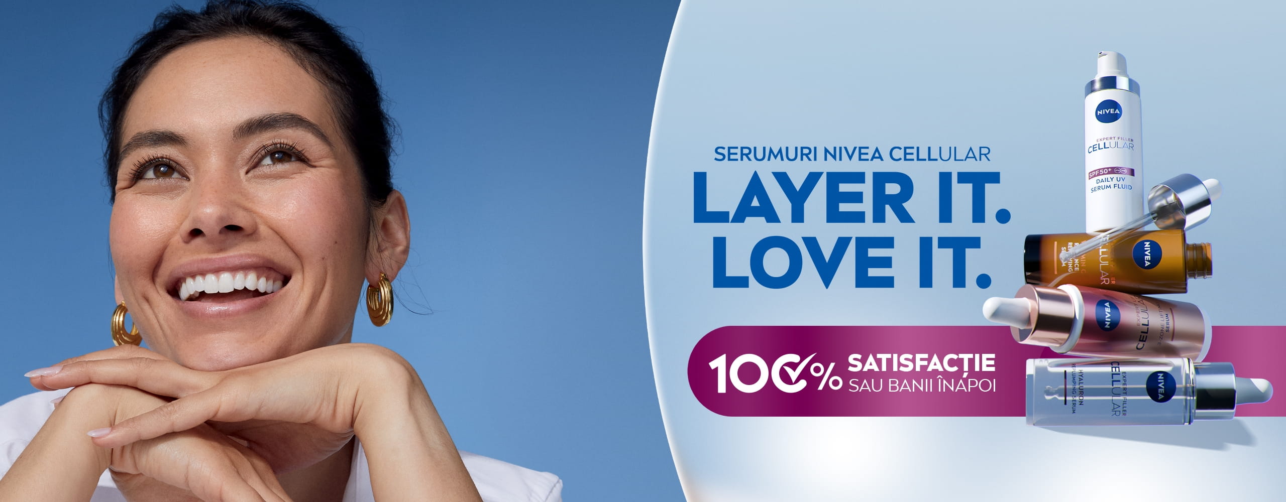 Serumul poate transforma complet rutina ta de îngrijire, iar NIVEA are o gamă variată de serumuri CELLULAR, perfecte pentru a fi îmbinate împreună, pentru orice nevoie a tenului tău! Cumpără orice serum de îngrijire NIVEA CELLULAR, testează produsul timp de 2 săptămâni (14 zile) și dacă nu ești mulțumită, primești banii înapoi GARANTAT!
