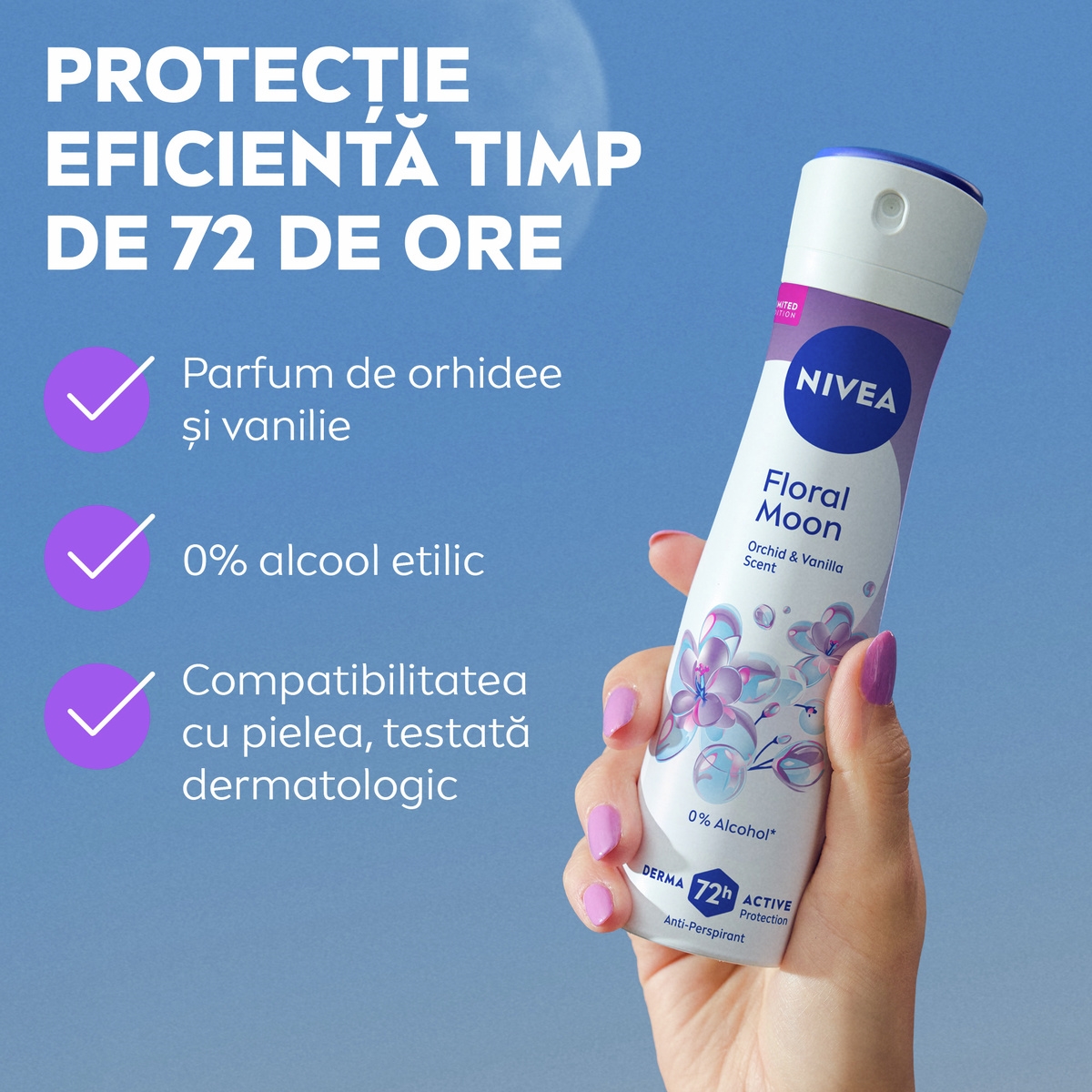 Antiperspirantul Spray NIVEA Floral Moon oferă protecție timp de 72 de ore. Cu parfum de orhidee și vanilie. 0% alcool. Testat dermatologic pentru o piele fină și catifelată.