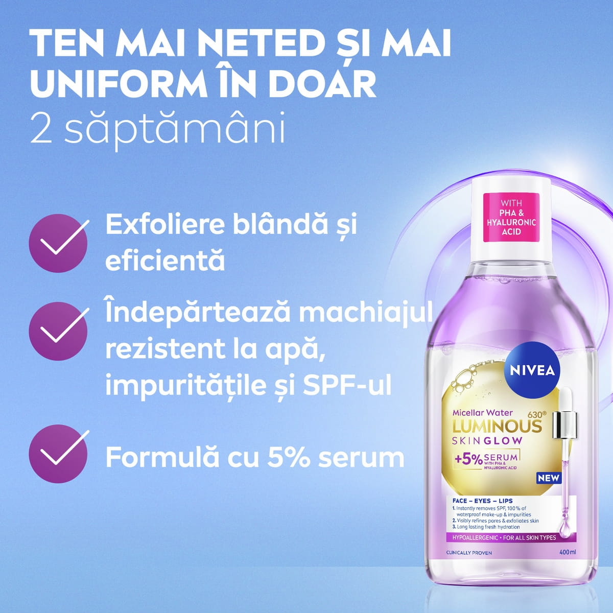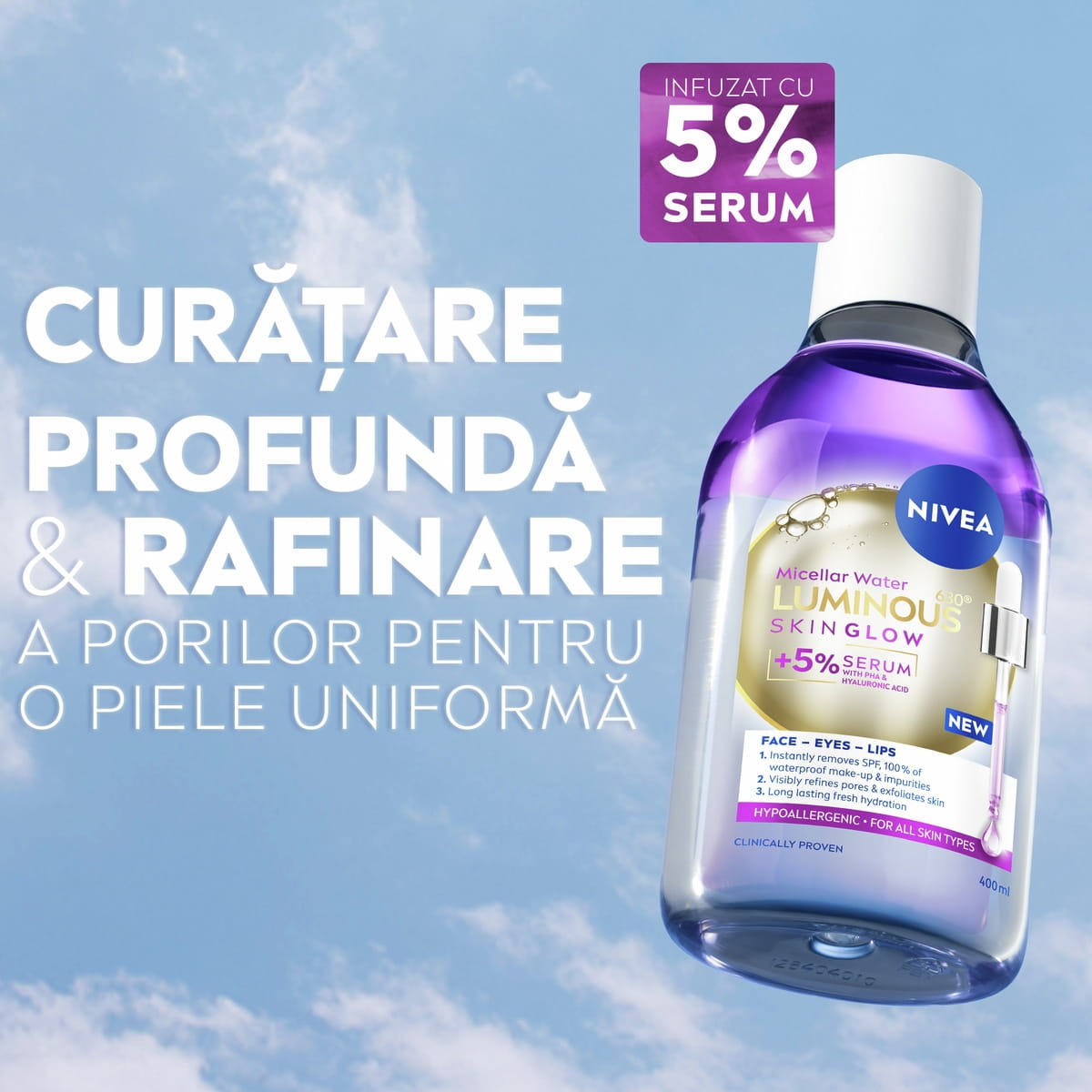 Îndepărtează instant machiajul rezistent la apă, impuritățile și SPF-ul cu Apa micelară NIVEA LUMINOUS630® SKIN GLOW îmbogățită cu serum. Formulă avansată ce contribuie la rafinarea porilor, cu rezultate vizibile: ten mai neted și mai uniform în doar 2 săptămâni. Pentru o senzație de prospețime și hidratare de lungă durată.