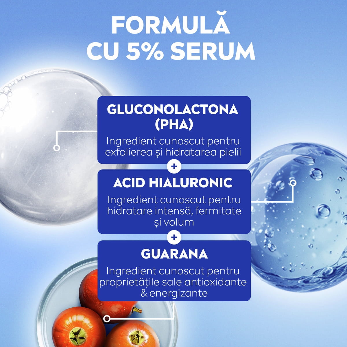 Cu un complex activ de 5% serum, 1% PHA și Acid Hialuronic, tenul este vizibil mai luminos, mai uniform și intens hidratat.