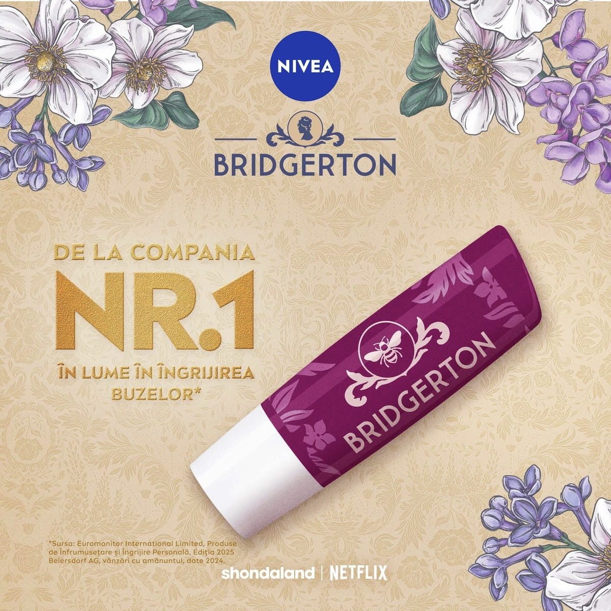 NIVEA x Bridgerton Ediție Limitată: Balsamul de buze Blackberry Pie hidratează buzele timp de 24 de ore, are o aromă delicioasă de mure și oferă un luciu subtil, de culoare burgundy.