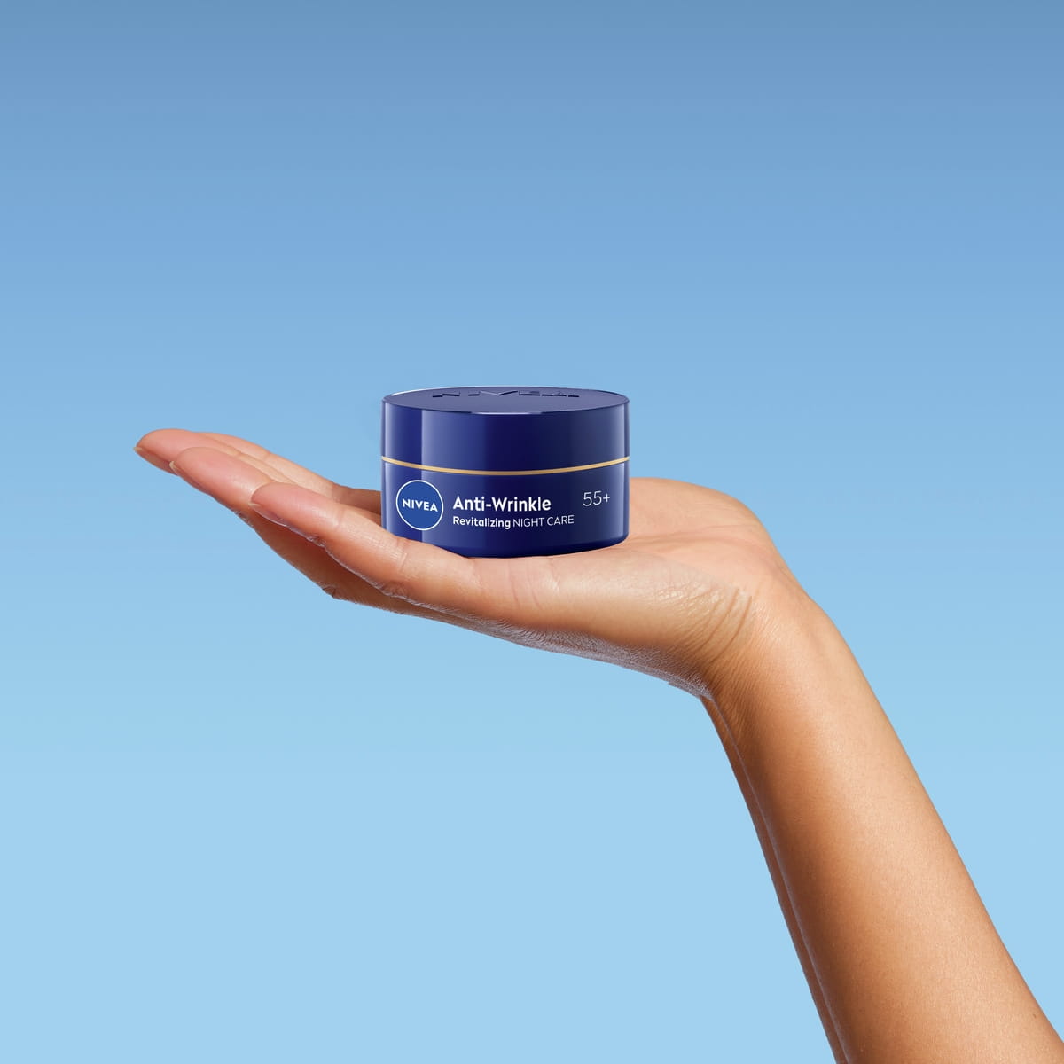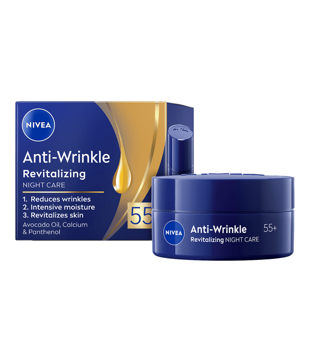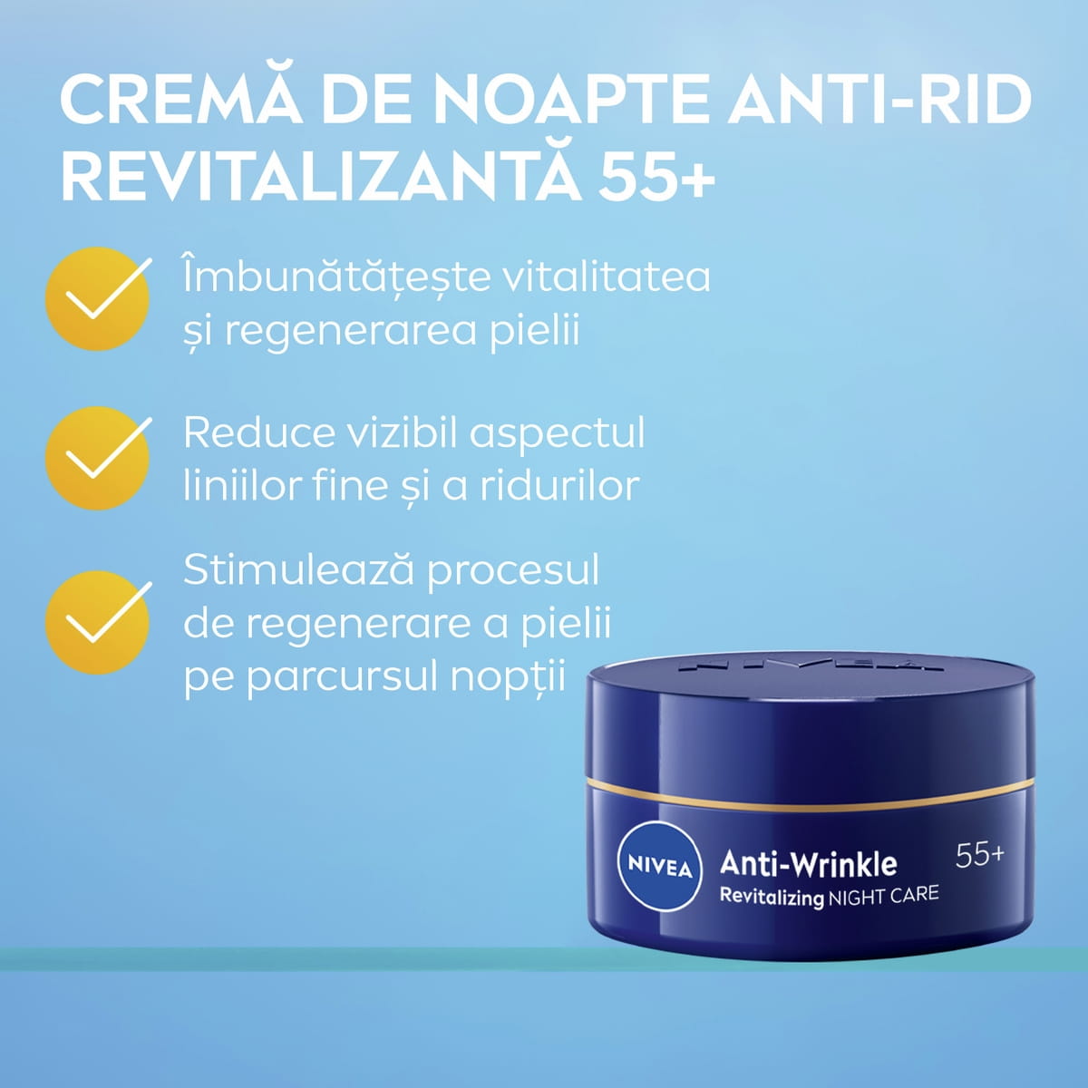 Diminuează aspectul ridurilor și îmbunătățește regenerarea pielii cu Crema de noapte anti-rid revitalizantă 55+.