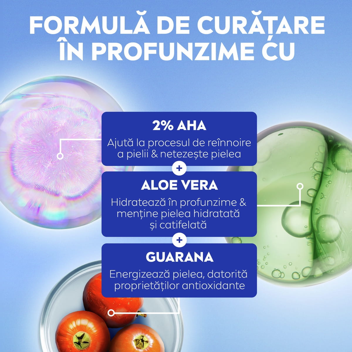 Primul nostru gel de curățare cu rezultate superioare și acizi eficienți - curăță profund, uniformizează pielea, netezește textura și oferă un aspect radiant, încă de la prima utilizare. Cu 2% AHA, Aloe Vera și Guarana.