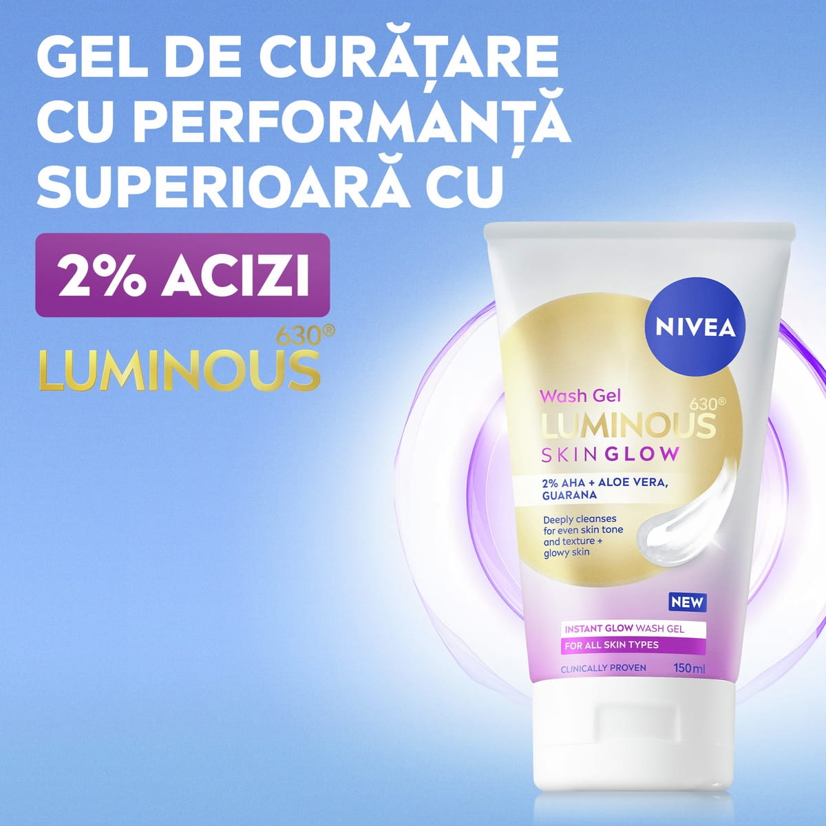 Gelul de curățare NIVEA LUMINOUS630 îndepărtează în profunzime impuritățile și acționează asupra celor 3 caracteristici ale unui ten luminos: