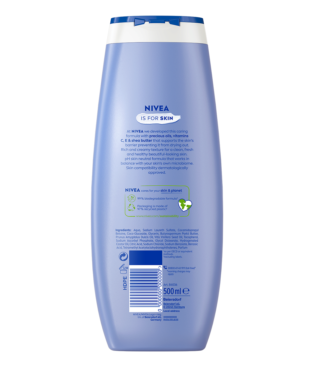 Gel de duș hidratant care îți lasă pielea moale și sănătoasă. Îmbogățit cu vitaminele C și E, uleiuri prețioase și unt de shea, acest gel de duș protejează pielea: Gel de duș NIVEA Creme Smooth.