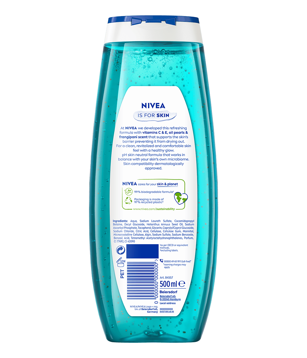Gel de duș revigorant care are grijă de pielea ta. Îmbogățit cu vitamina C, E și perle de ulei, acest gel de duș pentru corp protejează și îngrijește în mod natural pielea pentru o senzație de piele catifelată și împrospătată: gel de duș NIVEA Frangipani & Oil.