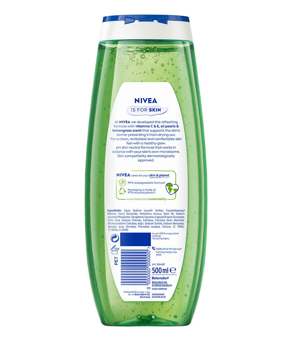 Gel de duș revigorant care are grijă de pielea ta. Îmbogățit cu vitamina C, E și perle de ulei, acest gel de duș protejează și îngrijește în mod natural pielea pentru o senzație de piele netedă și împrospătată: gel de duș NIVEA Fresh Care Lemongrass & Oil.
