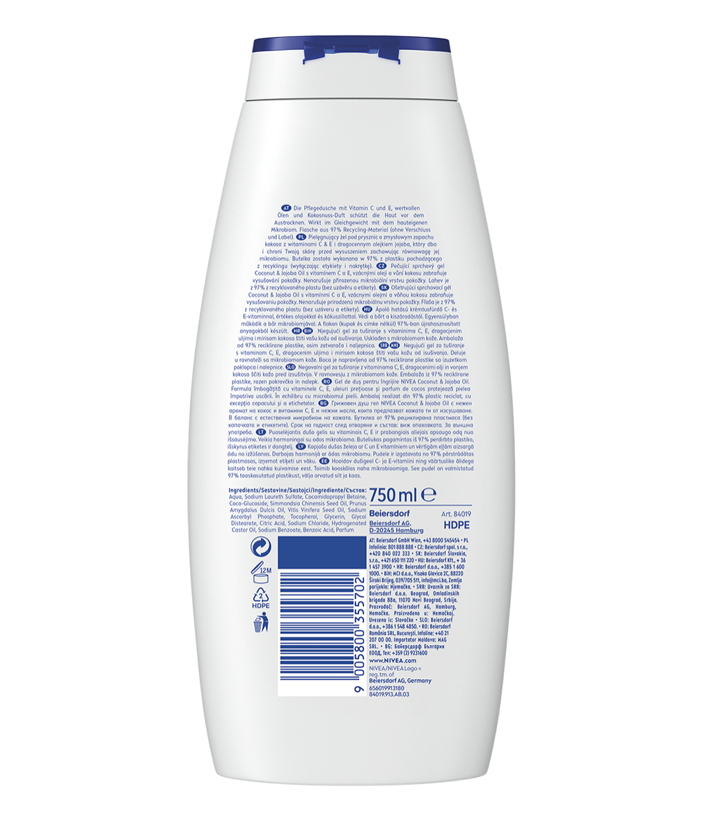 Gel de duș hidratant cu ulei de Jojoba pentru o senzație de piele catifelată și moale, de lungă durată. Formula cu vitaminele C și E și uleiuri prețioase pentru a proteja pielea împotriva uscăciunii: Gel de duș NIVEA cu Cocos și Ulei de Jojoba.