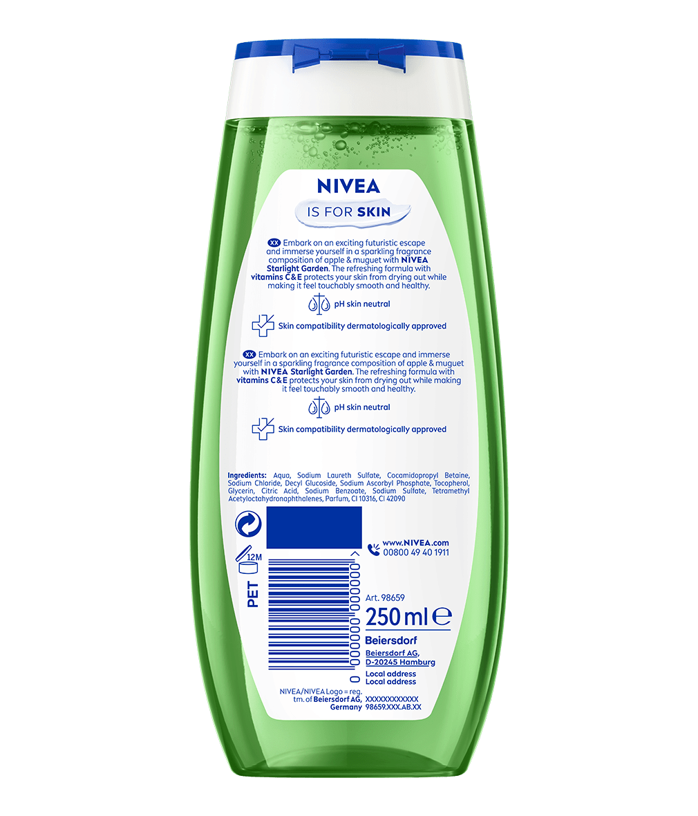 Pornește într-o evadare futuristă plină de farmec și bucură-te de parfumul revigorant de măr și lăcrămioare a gelului de duș NIVEA Starlight Garden. Formula revigorantă, îmbogățită cu Vitaminele C și E, protejează pielea împotriva uscării și o lasă catifelată la atingere și cu un aspect sănătos.