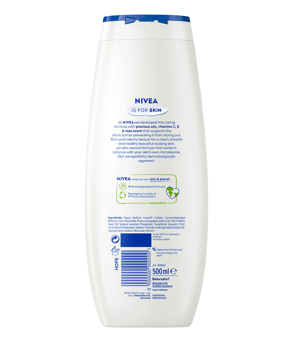 Gel de duș cu ulei de migdale pentru o senzație de piele catifelată, de lungă durată. Formulat cu vitamina C și E și uleiuri prețioase protejează pielea împotriva uscării: gel de duș NIVEA Rose & Almond Oil.
