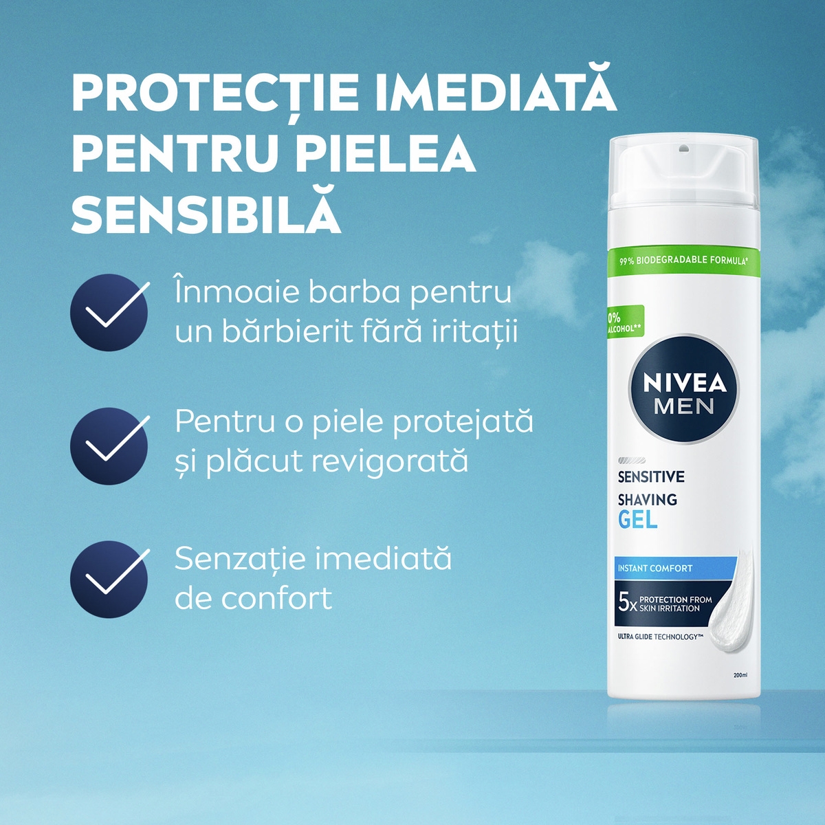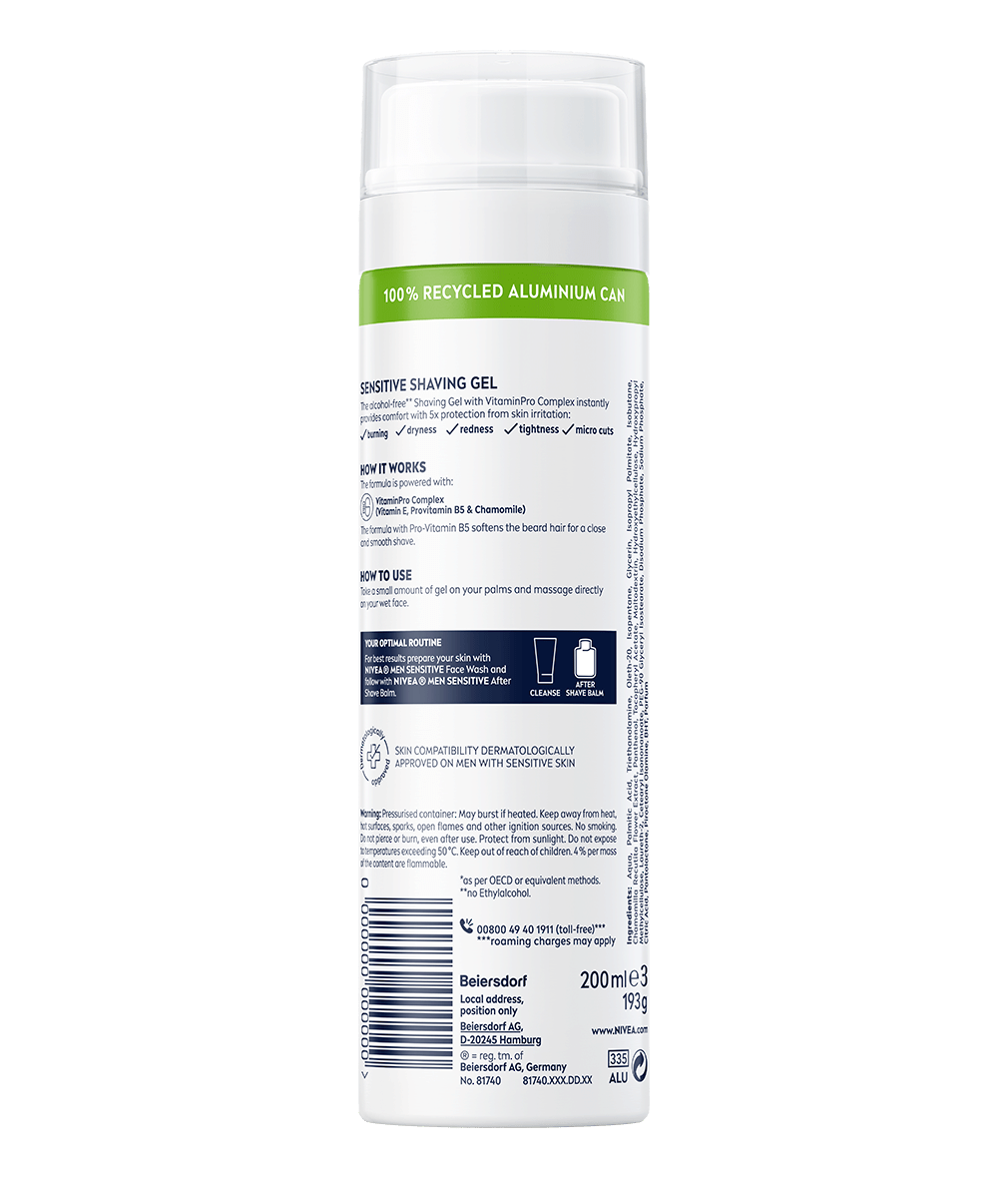 Gelul pentru ras NIVEA MEN Sensitive asigură un bărbierit precis și ușor, oferind protecție imediată împotriva iritațiilor pielii. Formula cu Mușețel, Pro-Vitamina B5 și Vitamina E este biodegradabilă în proporție de 99% și conține 0% alcool etilic. Testat dermatologic.
