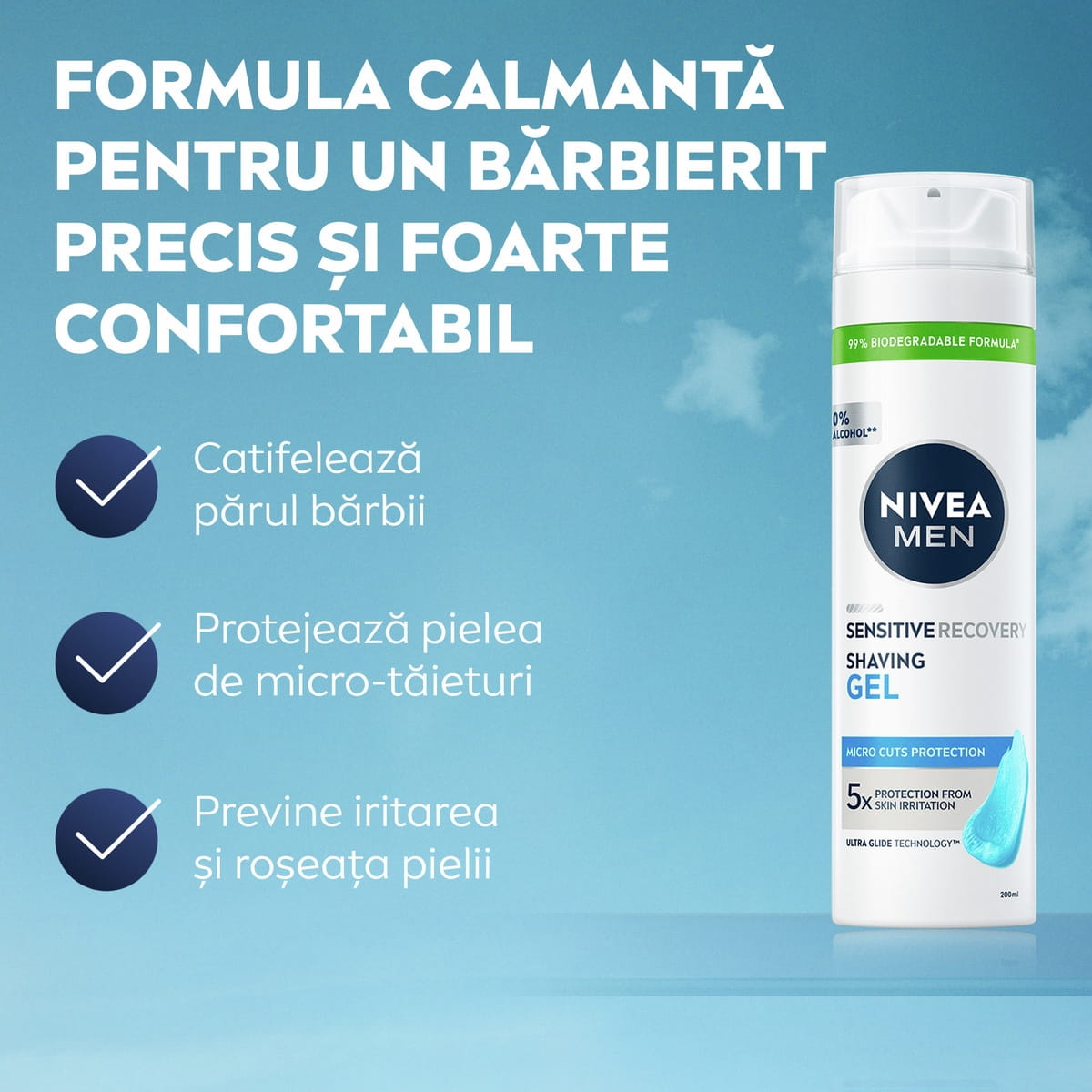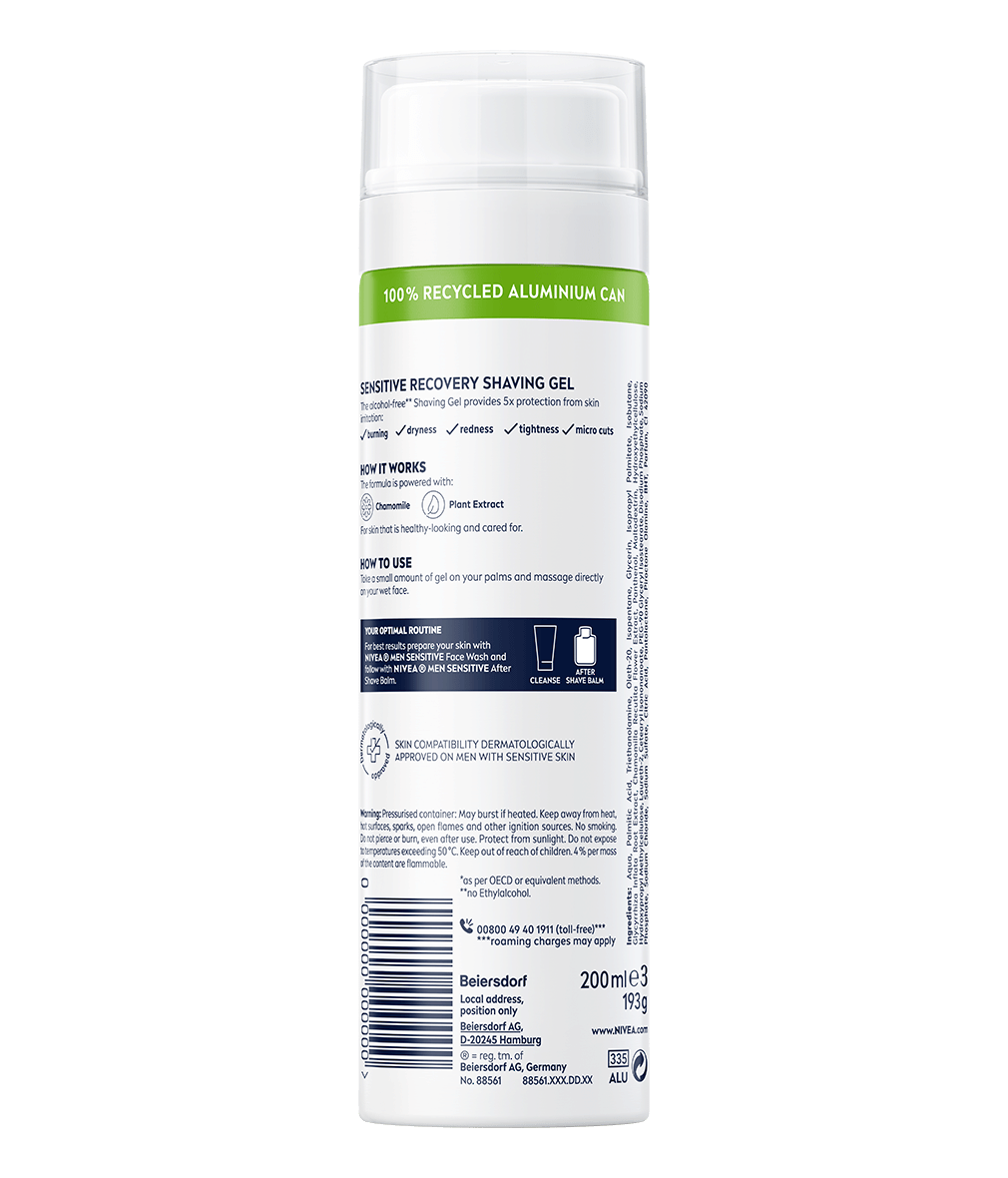 Gelul de ras NIVEA MEN Sensitive Recovery este special creat pentru bărbații care se bărbieresc zilnic. Formula specială previne micro-tăieturile, iritațiile și senzația de arsură – pentru o piele cu un aspect vizibil sănătos. Testat dermatologic pentru pielea sensibilă.