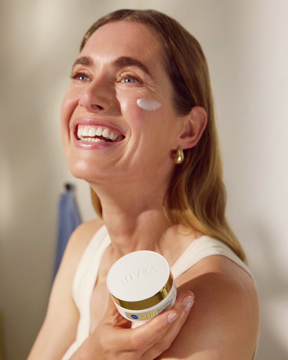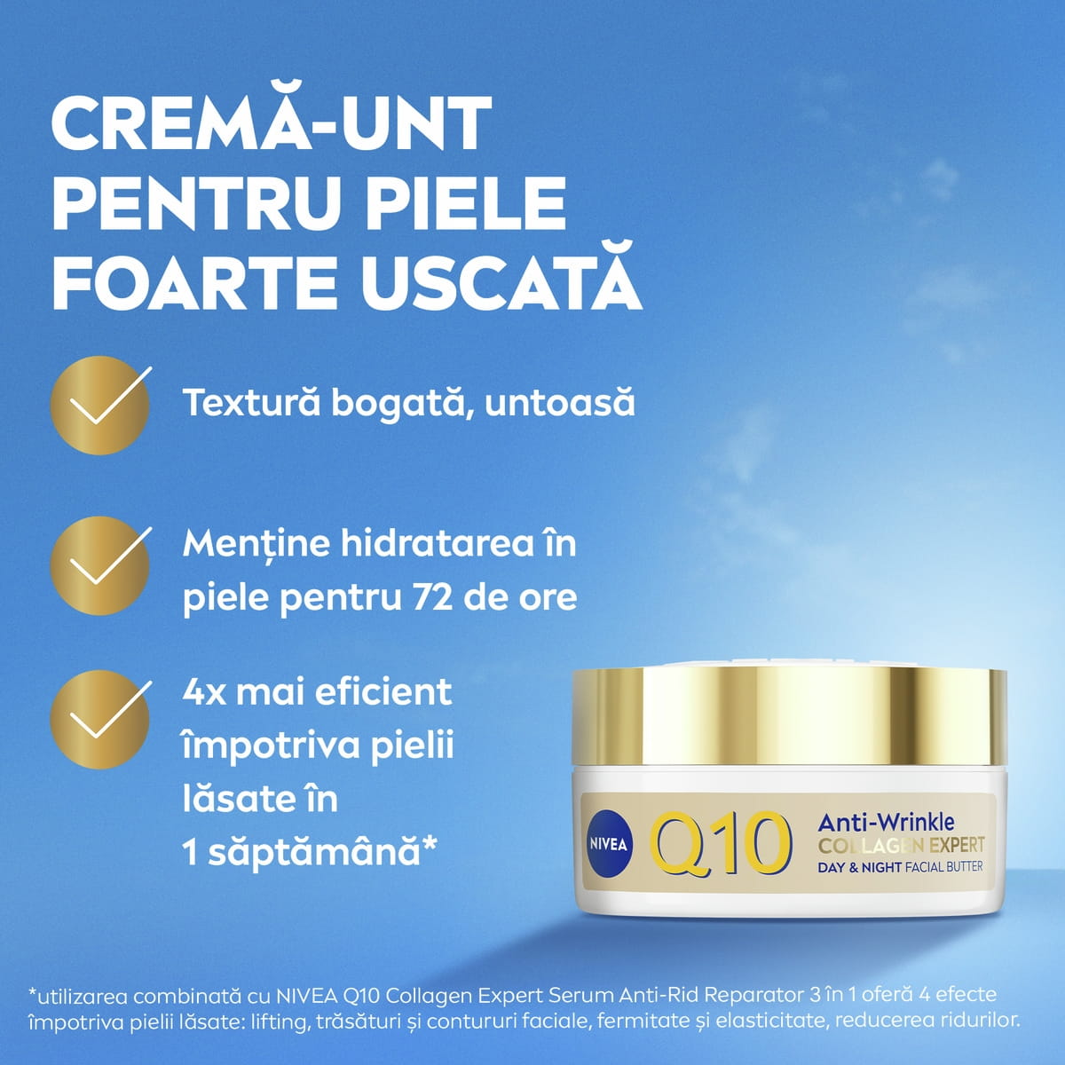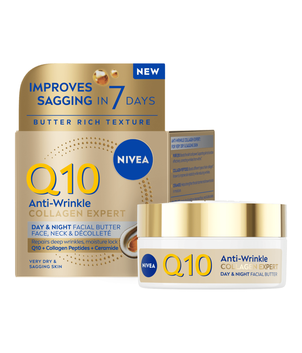NIVEA Q10 Collagen Expert Cremă-Unt Anti-Rid pentru față, de zi și de noapte, este special formulată pentru a hrăni pielea în profunzime. Are o textură bogată și untoasă, ce se topește în piele și întărește bariera de hidratare a acesteia.