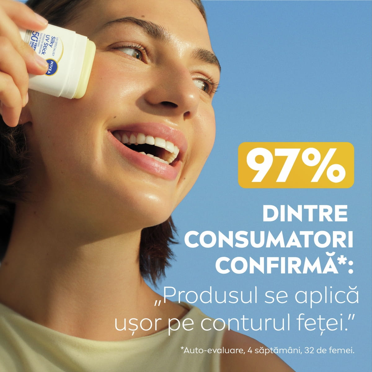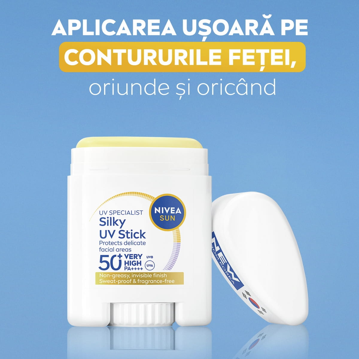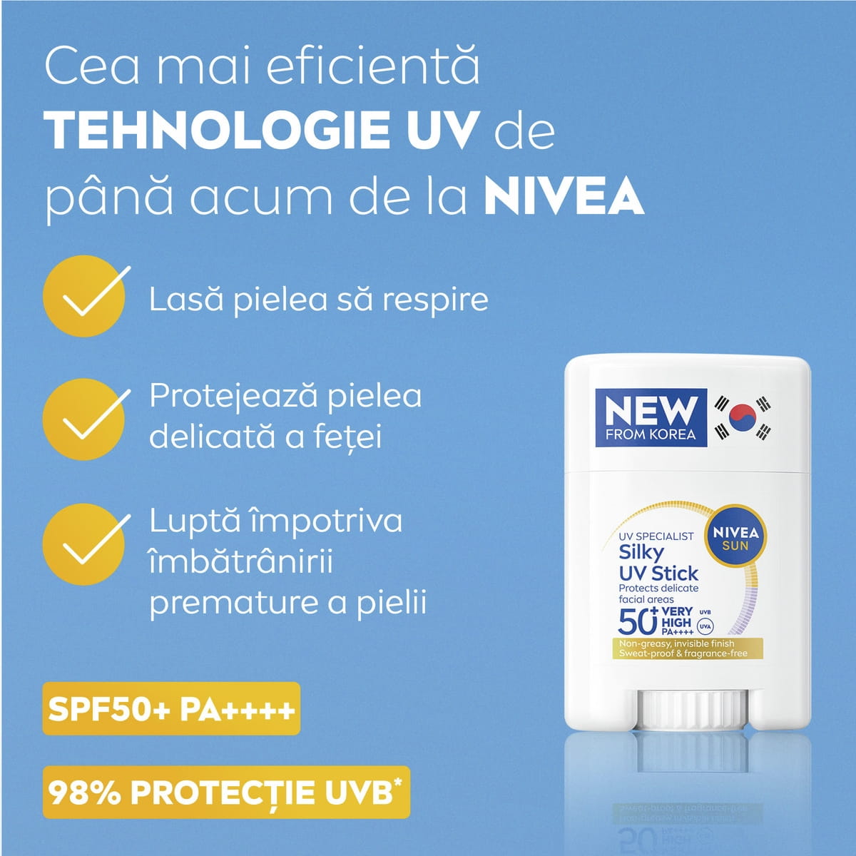 - CEA MAI EFICIENTĂ PROTECȚIE UV DE LA NIVEA, CARE LASĂ PIELEA SĂ RESPIRE – Tehnologie stick coreeană de ultimă generație, cu SPF 50+ și PA++++, care luptă împotriva fotoîmbătrânirii fără să încarce porii și oferă 98% protecție UVB.