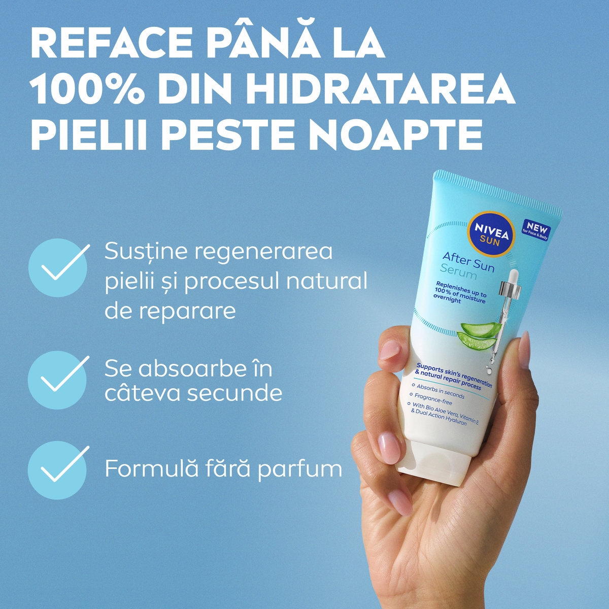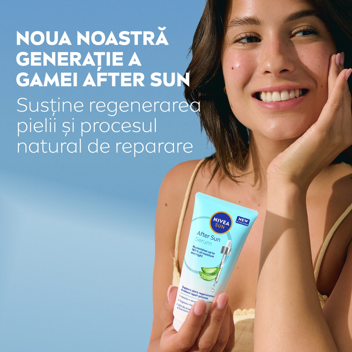 Hidratare completă pe timpul nopții, ce ajută pielea afectată de soare să se refacă și să se regenereze natural – nu conține parfum și are o textură ultra-ușoară, potrivită pentru față și corp: Serum NIVEA SUN After Sun