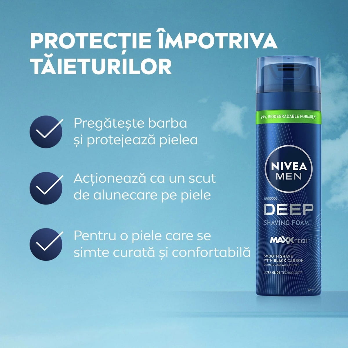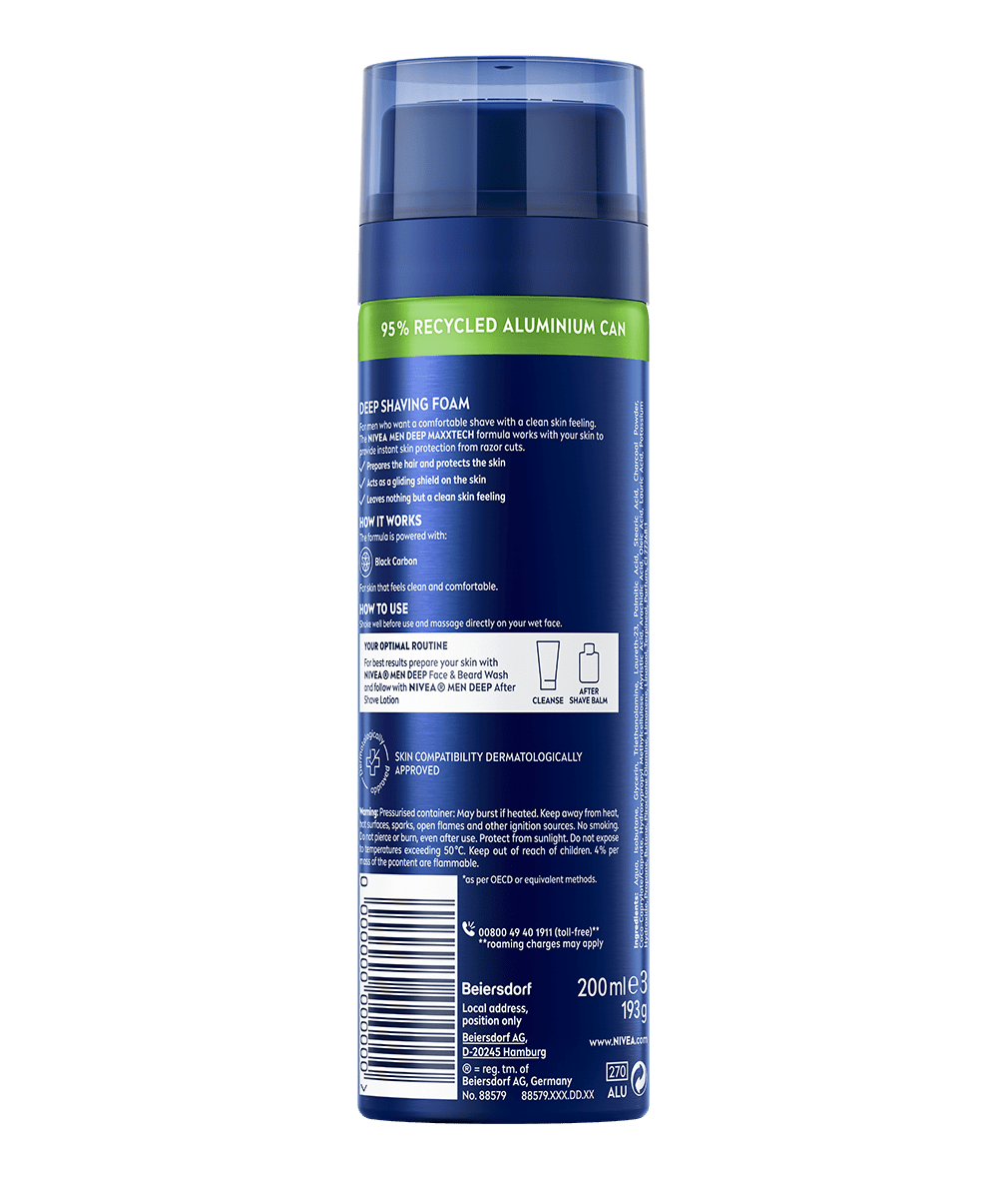 Spuma de ras NIVEA MEN Deep este ideală pentru bărbații care doresc un bărbierit confortabil cu o senzație de piele curățată în profunzime. Formula cu Carbon Negru pregătește firele de păr și îți protejează pielea de iritațiile în timpul bărbieritului.